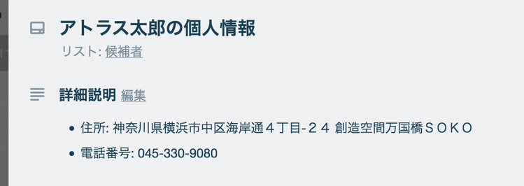 - 採用候補_個人情報ボードで「アトラス太郎の個人情報」カードを作成し、住所などを含めます。