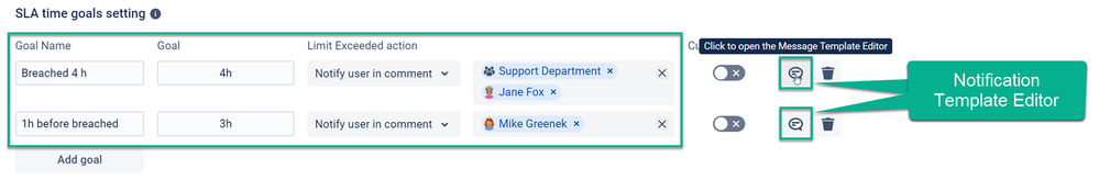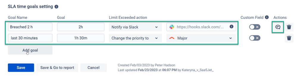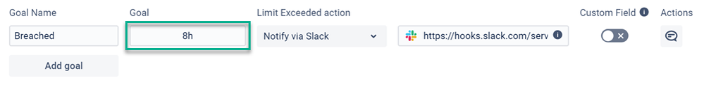 - For each SLA configuration, set the time goals. For us, it will be only Breached time with notifying to SLACK channel.